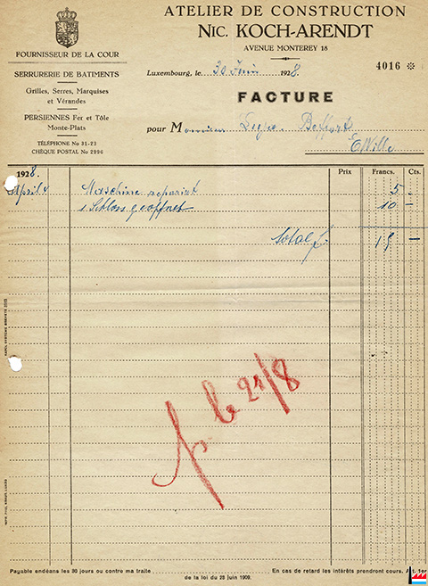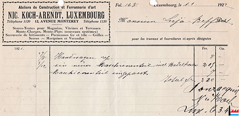 | 1908 | Fondation - Gründung Nicolas Koch übernimmt die Schlosserwerkstatt Gangler, Luxembourg-Stadt in der rue Notre-Dame, Luxembourg-Stadt (12 Marie-Theresienstraße) |