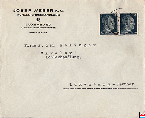 Kohlen-Grosshandlung Josef Weber K.G. 6, Michel Rodange-Strasse, Luxemburg (Enveloppe - Briefumschlag - 24.1.1944; Collection: industrie.lu)
