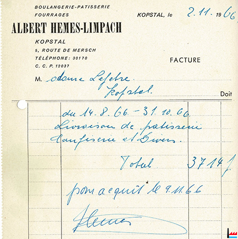 | <=1966 | ![]() Boulangerie - Bäckerei Hemes-Limpach Albert, Kopstal, 5 route de Mersch, tél: 30170 (Collection industrie.lu) |