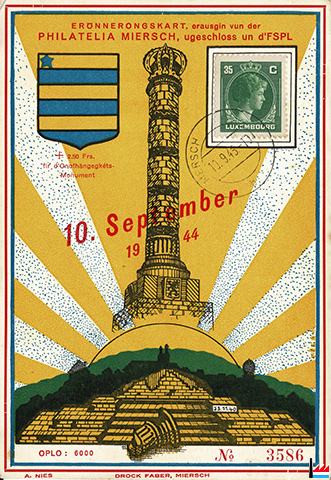 | 10.9.1944 | ![]() Monument Krounebierg, Mersch - Erönnerongskart - 10.9.1945, erausgin vun der Philatelia Miersch, ugeschloss un d'FSPL + 2,50 frs fir d'Onofhängegkéts-Monument (A. Nies; Drock Faber, Miersch; Collection: industrie.lu) |