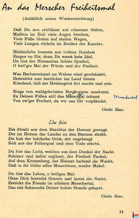 ![]() Poème de Lily Unden, lu par Eugène Schroeder, bourgmestre (Collection Nico Lucas) ![]() An das Merscher Freiheitsmal - Du bist - Cécile Ries (Collection Nico Lucas) |