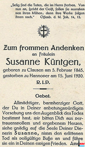 Zum frommen Andenken an Fräulein Susanne Küntgen, geboren zu Clausen am 3. Februar 1865, gestorben zu Hannover am 15. Juni 1920. |