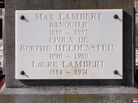 ![]() Plaque funéraire de Max Lambert, banquier (1888 - 1957), époux de Berthe Heldenstein (1890 - 1980), Laure Lambert (1884 - 1974) (Photo: 11.3.2010 jmo) Cimetière Notre-Dame, Luxembourg |