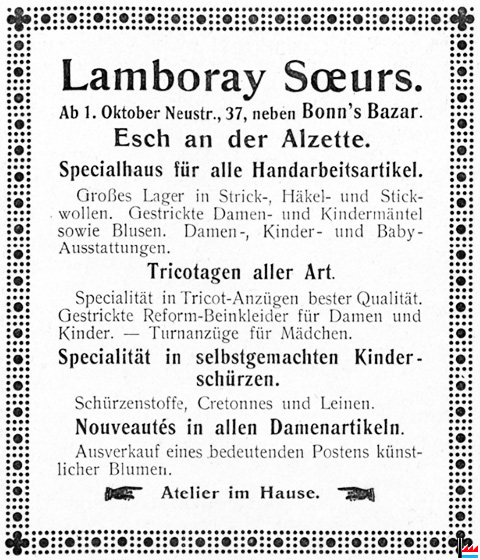 | 1.10.1912 - ? | Geschäftsverlegung. Verkaufshalber wird das Geschäft „Lamboray Sœurs" ab 1. Oktober 1912 aus der Poststraße in die Neustraße 37 verlegt, neben Bonn's Bazar. (Die Neue Zeit: 18.8.1912) |