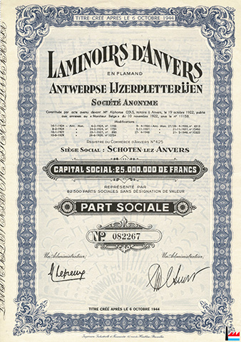 | 1948 | ![]() Action des Laminoirs d'Anvers - Antwerpse Ijzerpletterijen (Collection: industrie.lu) Siège social: Schloten - lez - Anvers |
