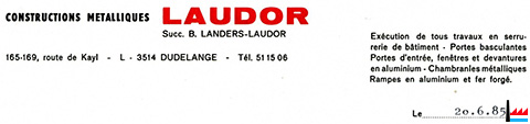 | <=1985 | Constructions Métalliques Laudor, Succ. B. Landers - Laudor, 165-169 route de Kayl, Dudelange | ||