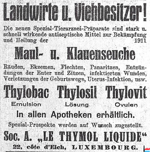 | 1938 | ![]() Le Thymol Liquide, 22, côte d’Eich, Luxembourg (LW: 14.6.1938) Thylobac - Thylosil - Thylovit |