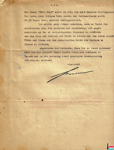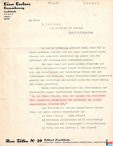 An Herrn V. Bodson, rue du Palais de Justice, Luxemburg (…). Als Referenz der von mir ausgeführten Bauten führe ich unter anderen nachfolgende an: