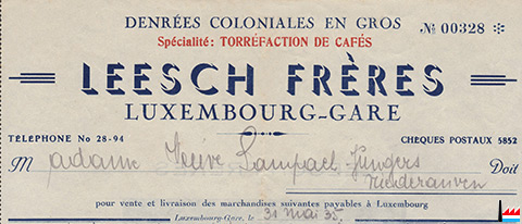 Leesch frères - denrées coloniales en gros - Spécialité: torréfaction de cafés - la plus moderne - la plus perfectionnée - la plus hygiénique, Luxembourg-Gare - Extraits d'une facture de 1935