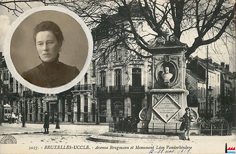 Le portrait de Madame Aline Lefebvre - Thémon collé sur une carte postale intitulée « Bruxelles - Uccle.- Avenue Brugmann et Monument Léon Vanderkindere ». (Collection famille Aschman - Bodson)