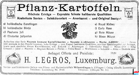 | 6.1946 | Allen meinen Kunden zur Mitteilung und Beruhigung, daß sämtliche von mir als «holländisch» gelieferten, und als «holländisch» berechneten Saatkartoffeln auch tatsächlich alle garantiert holländischer Herkunft sind, und in plombierten Waggons importiert wurden. HUBERT LEGROS LUXEMBOURG 49 rue de Strasbourg • Tel: 3945 (t: 1.6.1946) |