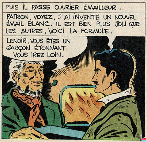 Etienne Lenoir, travaille dans une émaillerie:![]() Etienne Lenoir, a inventé l'émail blanc (Spirou N° 1657 de 1970; Collection: industrie.lu) |