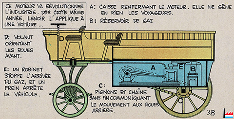 | 9. 1863 | ![]() Voiture Lenoir à moteur à gaz (Spirou N° 1657 de 1970; Collection: industrie.lu) La première automobile Lenoir, équipée d’un moteur à gaz de 1,5 CV, effectue 18 km en 3 h. |