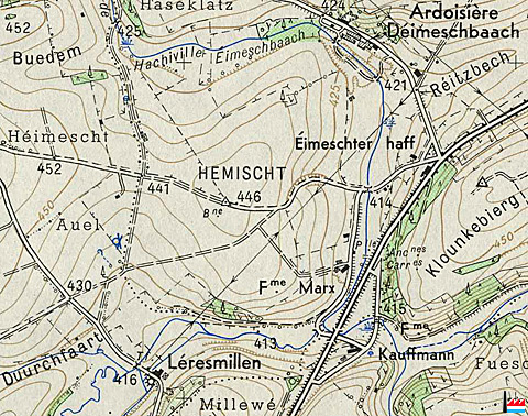 Héimescht - Hemischt - Léresmillen - Anciennes carrières - Ardoisière Déimeschbaach © Origine Administration du Cadastre et de la Topographie Luxembourg (ACT) - Extrait de la carte topographique à l'échelle 1: 20.000 édition 1964 - Autorisation de publication du 20.10.2010.»
