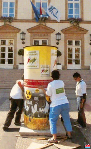 | 9.2003 | Neue Warnung - Die Umweltschutzorganisation Greenpeace gibt nicht auf. Nach der Stadtverwaltung Luxemburg hat sie in einer 2. Litfaßsäulen-Aktion den Staat aufgefordert, bei der Belieferung der Staatsgebäude auf den so genannten «Grünen Strom» überzuwechseln. Individuelle Briefe der Organisation an die betroffenen Ministerien bekamen scheinbar nur unzufrieden stellende Antworten. Eine 3. Säule wurde vor dem Parlamentsgebäude errichtet, wo die Abgeordneten sich ab Oktober mit erneuerbarer Energie befassen. (Revue: 3.9.2003) |