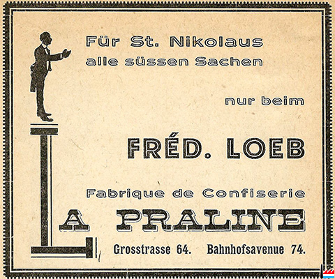 | <=12.1928 | Zuckerwarenhaus La Praline, Fred Loeb, 7 rue Chimay Beste Bezugsquelle für sämtliche Zuckerwaren |