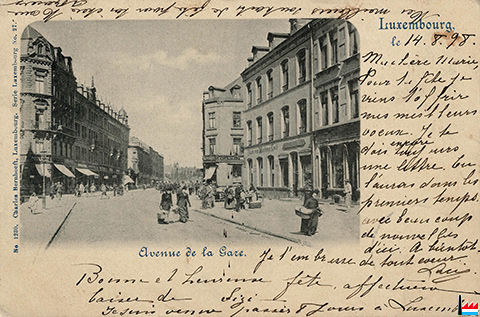 Münchener Kind'l, avenue de la Gare, Stad-Gare - Luxemburg-Bahnhof - Luxembourg-gare - Date poste: 14.8.1898 (Carte postale: No 1230 - Charles Bernhoeft, Luxembourg. Série Luxembourg No 27; Collection: industrie.lu)