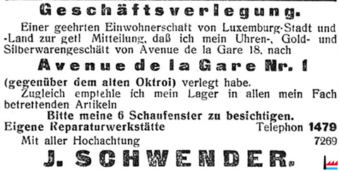 | 10.1922 | ![]() Geschäftsverlegung: Bijouterie Schwender Jules von Luxembourg, 18 avenue de la Gare nach Luxembourg, 1 avenue de la Gare (LW: 31.10.1922) |