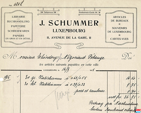 | <=10.1915 | ![]() Librairie - Papeterie J. Schummer, Luxembourg, 11 avenue de la Gare, tél: 228 - facture pour M. Théodory, Pétange, négociant (Collection: industrie.lu) Papiers en gros et en détail, articles de bureaux, souvenirs de Luxembourg, cartes-vues |