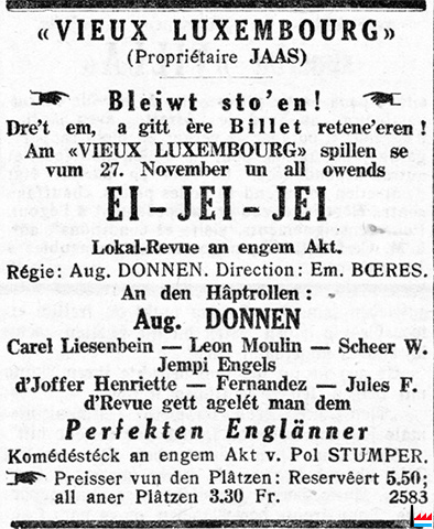 | 3.1920 | Surprise musicale au Vieux-Luxembourg Une agréable surprise fut donnée dimanche aux visiteurs du « Vieux-Luxembourg». Vers les 5 heures une automobile s'arrêta devant le susdit établissement et deux messieurs élégamment vêtus en descendirent. Les étrangers demandent à causer au patron de rétablissement, l’aimable M. Jaas, ils lui expliquaient le but de leur excursion. Nous venons d’apprendre qu’il s'agit d'une tournée théâtrale d’amateurs belges qui de passage à Luxembourg voulaient se produire devant le public luxembourgeois. M. Jaas ne vit aucun inconvénient à leur offre, surtout que l’imprésario belge M. Jean Oswald proposait l'exécution gratuite de différents extraits d’opéras connus. C’est ainsi que vers 6 heures les artistes, tous élèves du Conservatoire de Bruxelles dont nous n’avons malheureusement pu apprendre les noms, costumés et grimés pour la circonstance, nous chantent le premier acte de Faust. Inutile de dire que les voix fraîches et sonores ont fait la meilleure impression sur le public qui ne leur a pas ménagé ses applaudissements. Dans la soirée les artistes nous firent entendre des fragments de l’opéra "La Favorite de Donizetti" et c’est à grand regret que nous devons quitter les artistes qui nous ont procuré quelques heures agréables. Une mention spéciale pour M. Haching, pianiste du Vieux-Luxembourg, qui a su déchiffrer avec grande facilité les différentes parties d'opéra. Nous souhaitons aux jeunes amateurs belges un succès complet pour leur voyage artistique et espérons les revoir sous peu. Qu’ils nous préviennent seulement à temps de leur arrivée et ils trouveront des salles combles. R.H. (LIL: 9.3.1920) |