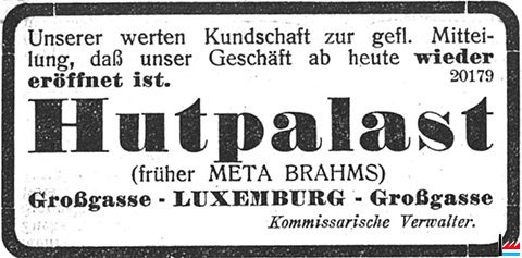| 10.1940, 1944 | ![]() Hutpalast; Luxemburg, Großgasse (LW: 22.10.1940) frühere Meta Brahms, Kommissarische Verwalter |