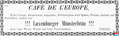 Weder Löwenbräu, Franziskanerbräu, Augustinerbräu, Weihenstephanbräu noch Spatenbräu, Pschorrbräu, Zacherlbräu und Facherlbräu, sondern nur !!! Luxemburger Münsterbräu !!! Auch keine Wiener Würst’l und keine Pickel-Sardinen (LIL: 21.11.1880) |
