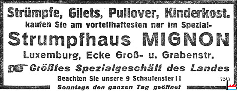 | 1932 | ![]() Chapellerie Mersch-Berweiler fils - L. Perlia - Strumpfhaus Mignon (Photo: 1902 Batty Fischer) |