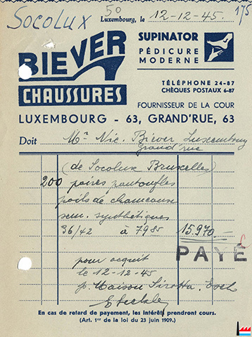 | <=12.1945 | ![]() Chaussures Biever - 1945 (Collection: industrie.lu) 63 Grand'Rue Luxembourg Tél: 2487 Supinator, pédicure moderne |