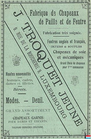 | 1904 | ![]() 1904 - Fabrique de chapeaux de paille et de feutre - J. Troquet Jeune, 9, rue de la Boucherie, Luxembourg - Dans: Luxemburger Handels-Adressbuch - 1904 (Collection Philippe Aschman) |