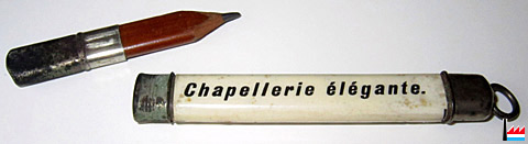 ![]() Objet publicitaire - porte-crayon (longueur: 9 cm) (Collection Charles-Louis Aschman) Chapellerie élégante J. Troquet jeune 9 rue de la Boucherie 9 LUXEMBOURG |
