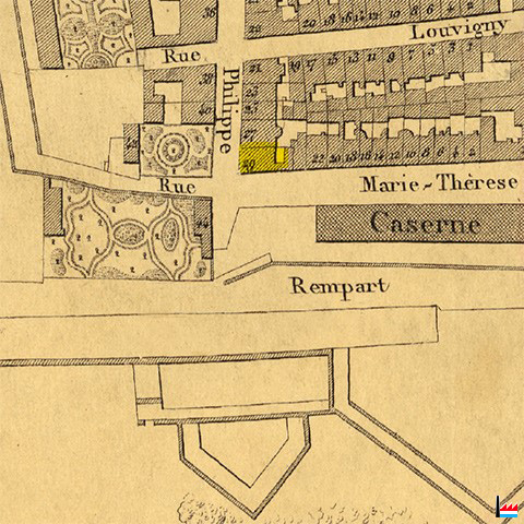 | 1862 | ![]() Luxembourg, coin 29 rue Philippe - rue Marie-Thérèse (Plan de la Ville et de la Forteresse de Luxembourg, dressé par J.B. Liesch, vérificateur-chef de bureau du Cadastre - 1862) |