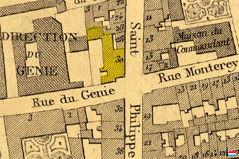 | 1862 | ![]() Luxembourg, 30 rue Philippe (Plan de la Ville et de la Forteresse de Luxembourg, dressé par J.B. Liesch, vérificateur-chef de bureau du Cadastre - 1862) |