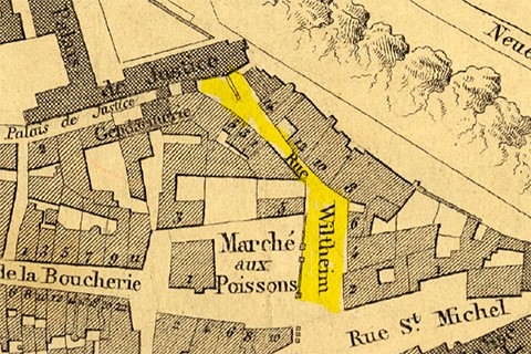 Rue du Palais de Justice - Rue Wiltheim - Marché-aux-Poissons - Rue St. Michel (Plan de la Ville et de la Forteresse de Luxembourg, dressé par J.B. Liesch, vérificateur-chef de bureau du Cadastre - 1862)