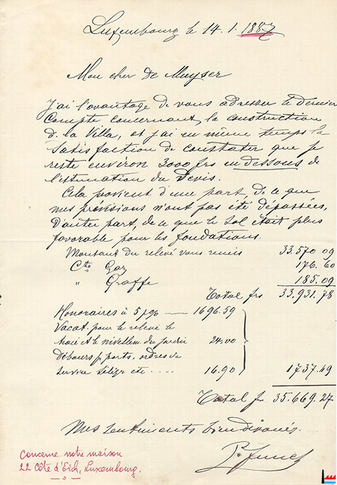 | 1886 | La maison N° 22 Côte d'Eich à Luxembourg fut construite en 1886 par l’architecte Pierre Funck pour Me Zénon de Muyser, président de la Chambre des députés. Elle fut attenante à celle des Velter-Simons. Après le décès de Me Zénon de Muyser le 13 juin 1887, sa famille s’installa au Rollingergrund, en face de l’église. Le coût de la villa s’éleva à 39.419,27 francs :