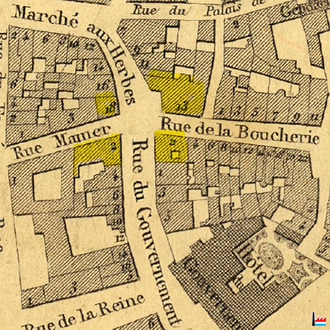 | <=1862 | 13 Marché aux Herbes | Lentzeneck, 2 rue de la Boucherie | 2 rue du Gouvernement | 18 Marché-aux-Herbes | |