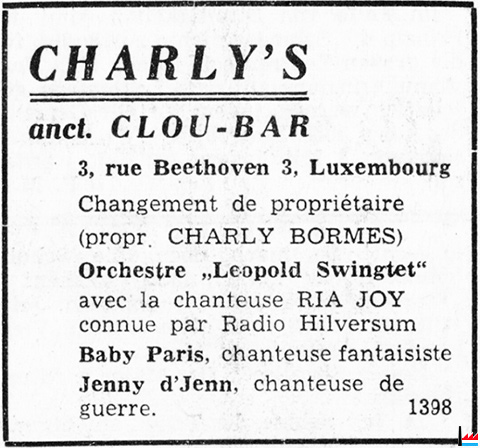 | 5.1947 | Den Charly’s Bar ass schon eng geraum zeit zo'. Virum établissement leie ke'p steng a sand, bannenan get emseg geschafft. Et rumo'ert an allen ecke vun der stâd, iwerall get neigebaut, emgebaut, renove'ert, versche'nert, den zeitgeme'ssen uspréch ugepasst, Och den Charly's Bar go'w vum baufe'wer ergraff. D'clientèle werd gespannt sin op d'resultat vun de langen arbechten, wa ge'nt mëtt vum mo'nt d'réourertvire ugekënnegt get.(D'Unio'n: 5.5.1947) |