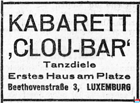 | <=1941 | ![]() Kabarett Clou-Bar - Tanzdiele - Erstes Haus am Platze, Beethovenstraße 3, Luxemburg (LW: 18.1.1941) |