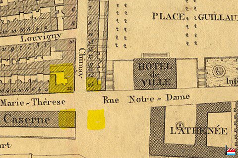 | 1862 | ![]() Luxembourg, coins rue Notre-Dame (anc. rue Marie-Thérèse) - rue Chimay (Plan de la Ville et de la Forteresse de Luxembourg, dressé par J.B. Liesch, vérificateur-chef de bureau du Cadastre - 1862) |