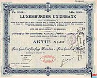 | Luxemburger Unionbank La Banque ne fait pas d'opérations de banque courantes ; elle s'occupe surtout de l'acquisition, de l'administration et de la vente d'actions, d'obligations et de parts de sociétés industrielles et de banques et de toutes autres espèces de valeurs; elle prend dés participations dans les sociétés de toute nature qui s'occupent d'entreprises industrielles de constructions et d'exploitation de chemins de fer, l'acquisition et la vente de propriétés immobilières; d'affaires de banque et de finances en général, de prèts à des sociétés industrielles, des sociétés de chemins de fer et de banque et des avances contre dépôts ou valeurs. Capital : 4.000.00. francs. Directeurs : MM. Adolphe Turk et Jos. Wurth - Weiler, à Luxembourg Fondé de pouvoirs : M. Alphonse Sturm, Luxembourg Acte de constitution : 20 février 1907 (Registre aux firmes N° 2 - Du 4 mars 1910) |