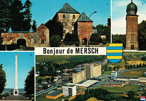 Mersch - 1. Le Château (1232) - 2. Tour Saint Michel - 3. Monument du Centenaire de l'Indépendance - 4. Les Silos de la Centrale Paysanne - vers 1975