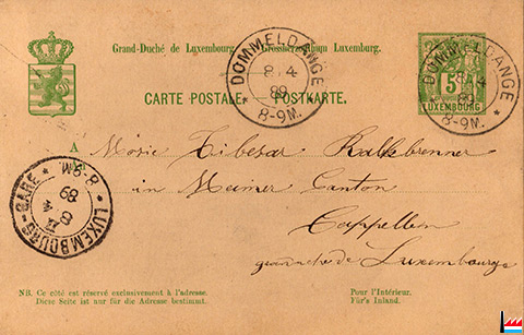 | <=1889 | ![]() Postkarte von Nicolas Wolff, Maurer in Eich an Tibesar, Kalkbrenner, Mamer - 8.4.1889 (Carte postale: collection industrie.lu) |