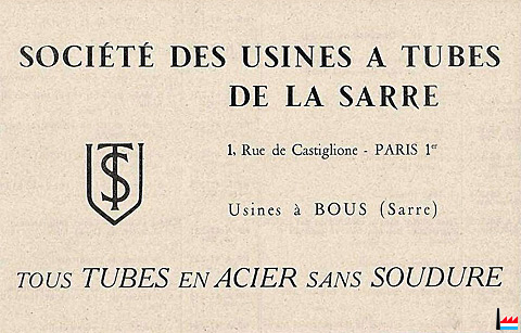 | 9.1920 | SAUTS - Société Anonyme des Aciéries et Usines à Tubes de la Sarre, Paris Röhrenwerk Bous + Gußstahlwerk Saarbrücken Capital: 50.000.000 fr - 100.000 actions de 500 francs, dont 40.000 ont été attribuées à Mannesmann-Röhren-Werke en rémunération de ses apports Achat de 2 usines que la Mannesmann-Röhren-Werke possédait dans la Sarre: Usines à Tubes de Bous et les Aciéries de Burbach Direction: Marette |