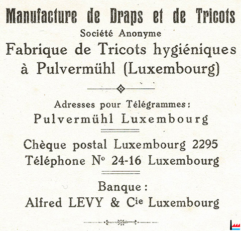| 1934 | ![]() Manufacture de Draps et de Tricots S.A. - Fabrique de Tricots hygéniques à Pulvermühl-Luxembourg - entête d'un bordereau des factures - signé par Emile Godchaux - 1.12.1934 (Collection: industrie.lu) |
