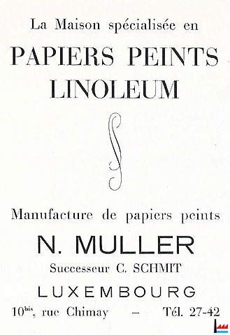 | <=1948 | Manufacture de papiers peints N. Muller, successur C. Schmit 10bis rue Chimay, Luxembourg |