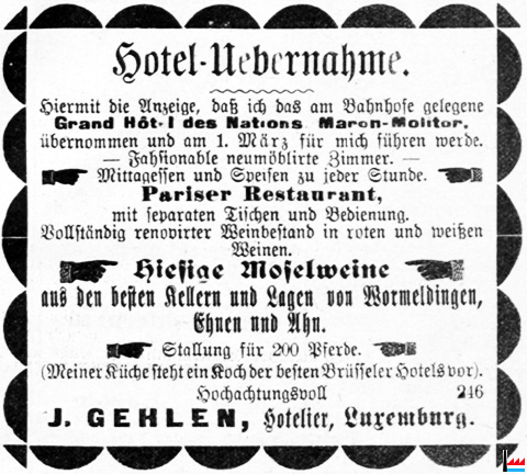 | 9.1898 | Reprise de l'Hôtel de l'Europe, Luxembourg, Porte-Neuve, par M. Maron-Molitor, ancien propriétaire de l'Hôtel des Nations, Luxembourg-Gare |