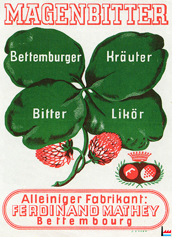 Bettemburger Kräuter Bitter Likör - Alleiniger Fabrikant Ferdinand Mathey, Bettembourg - mit dem alten Bettemburger Wappen