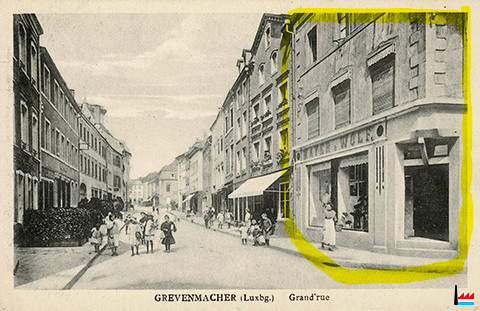 ![]() S. Mayer, Grevenmacher, Ecke Großgasse - Triererstrasse - <=1911 (Extrait de la carte postale: 146491 Collection: industrie.lu) ![]() Grevenmacher, Großgasse - <=1911 (Carte postale: 146491 Collection: industrie.lu) Victor Koenig, Rotes Haus - Café P. Birong-Birong - S. Mayer |