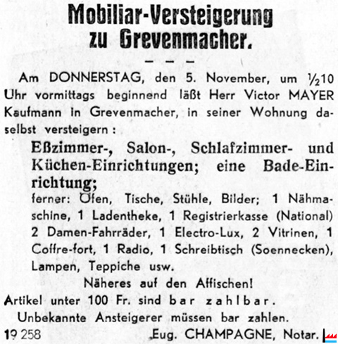 | 10.1936 | Grevenmacher - Le prix des immeubles - Une maison de commerce et d’habitation, sise au coin dit „Prosteneck“, appartenant à M. Victor Mayer, a été adjugée à M. Fritz Gehlhausen-Fischer, cafetier à Grevenmacher, pour le prix de 250.000 fr. (Luxembourg - Journal du Matin: 20.10.1936) |