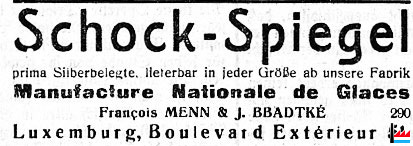 | 1921 | Manufacture Nationale de Glaces François Menn & J. Bradtké Boulevard Extérieur 51 (= Boulevard Grande-Duchesse Charlotte) Luxembourg |