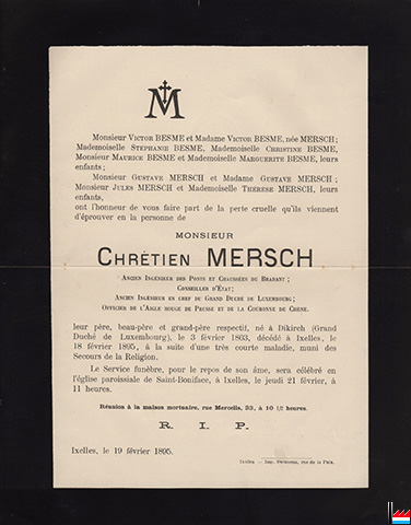 Chrétien / Christian Mersch (* 3.2.1803 Diekirch / Luxembourg, + 18.2.1895 Ixelles / Belgique), ingénieur, fils de Mathias Mersch et Marie-Catherine Delvaux, époux de Stéphanie Lejeune (1808 Fontaine-l'Eveque / Belgique - 1863 Luxembourg)